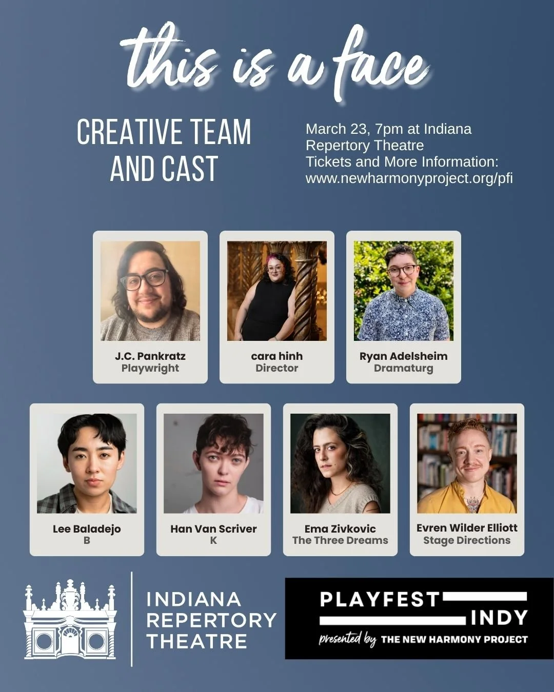 Join us at IRT on March 23rd at 7pm for the reading of J.C. Pankratz’s play this is a face, the fourth project in NHP’s PlayFest Indy season. To make a reservation, go here. Or check out the PlayFest Indy page for more information!